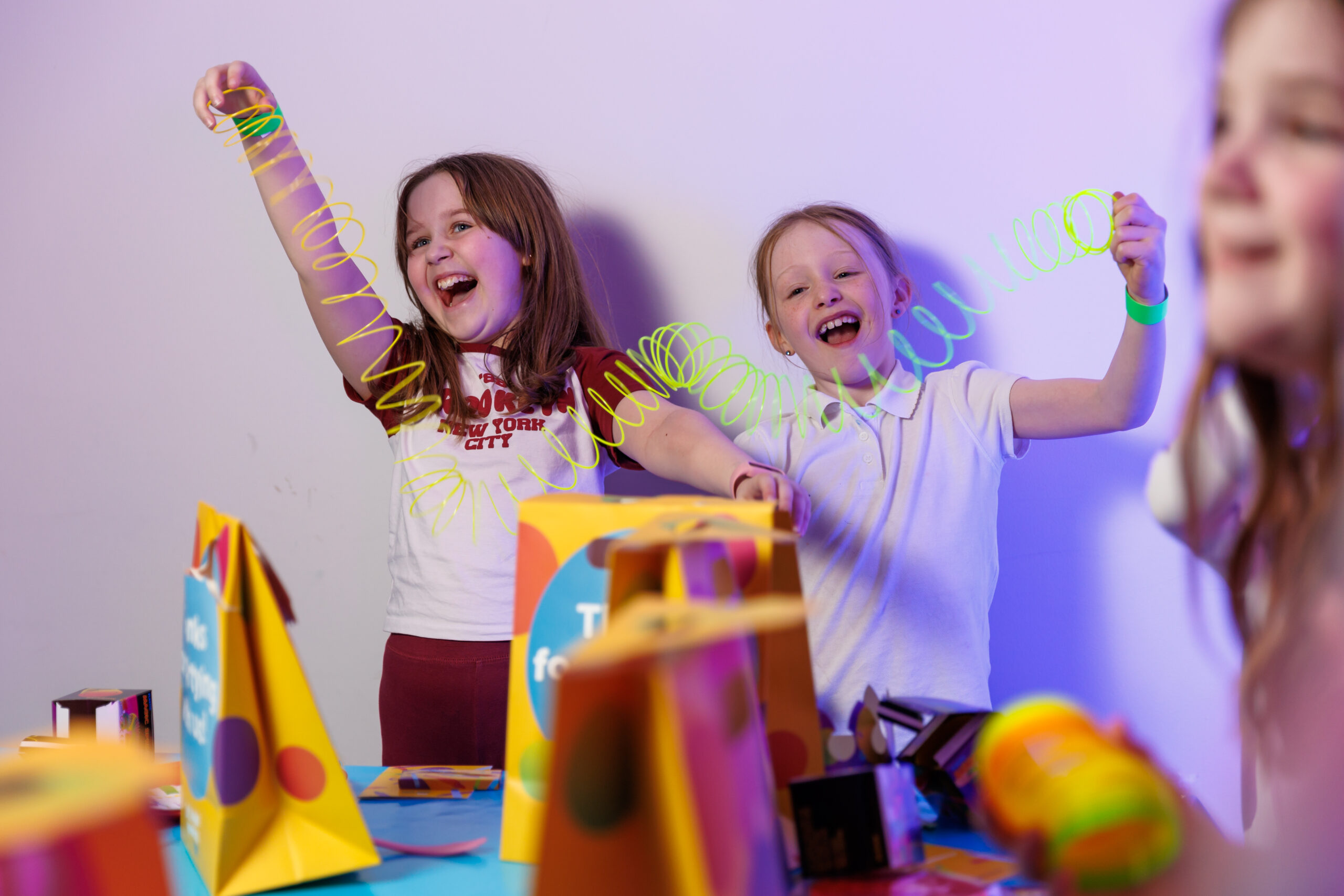 Our party bags include a colouring book, a packet of crayons, a fidget popper toy, and a fun slinky all wrapped up nice and neatly in a WonderWorld party bag to easily take home.