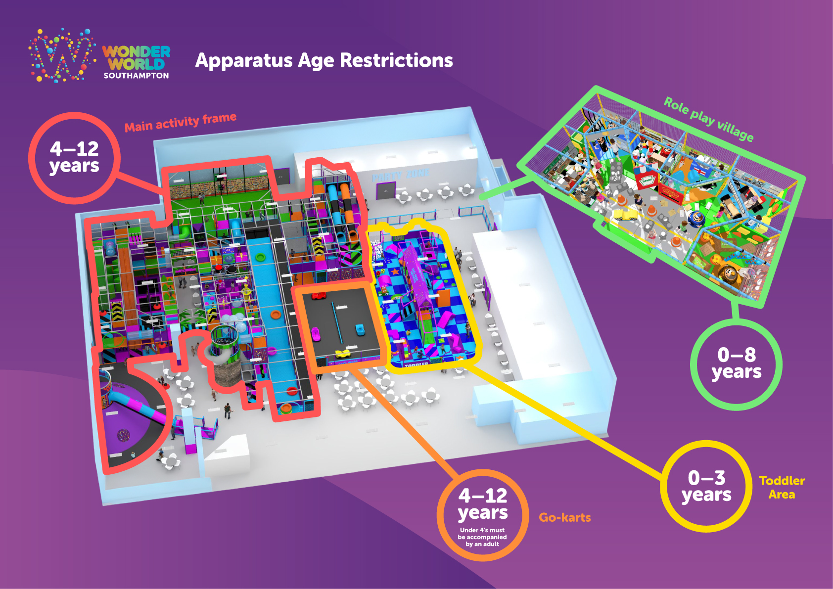 We have age restrictions of 0 to 12 years of age in WonderWorld Soft Play. Some of our equipment is only suitable for certain age groups. Please familiarise yourself with our rules prior to participation. Please note that no adults are permitted on the Volcano slide. Signage is visible throughout the venue and playframe.